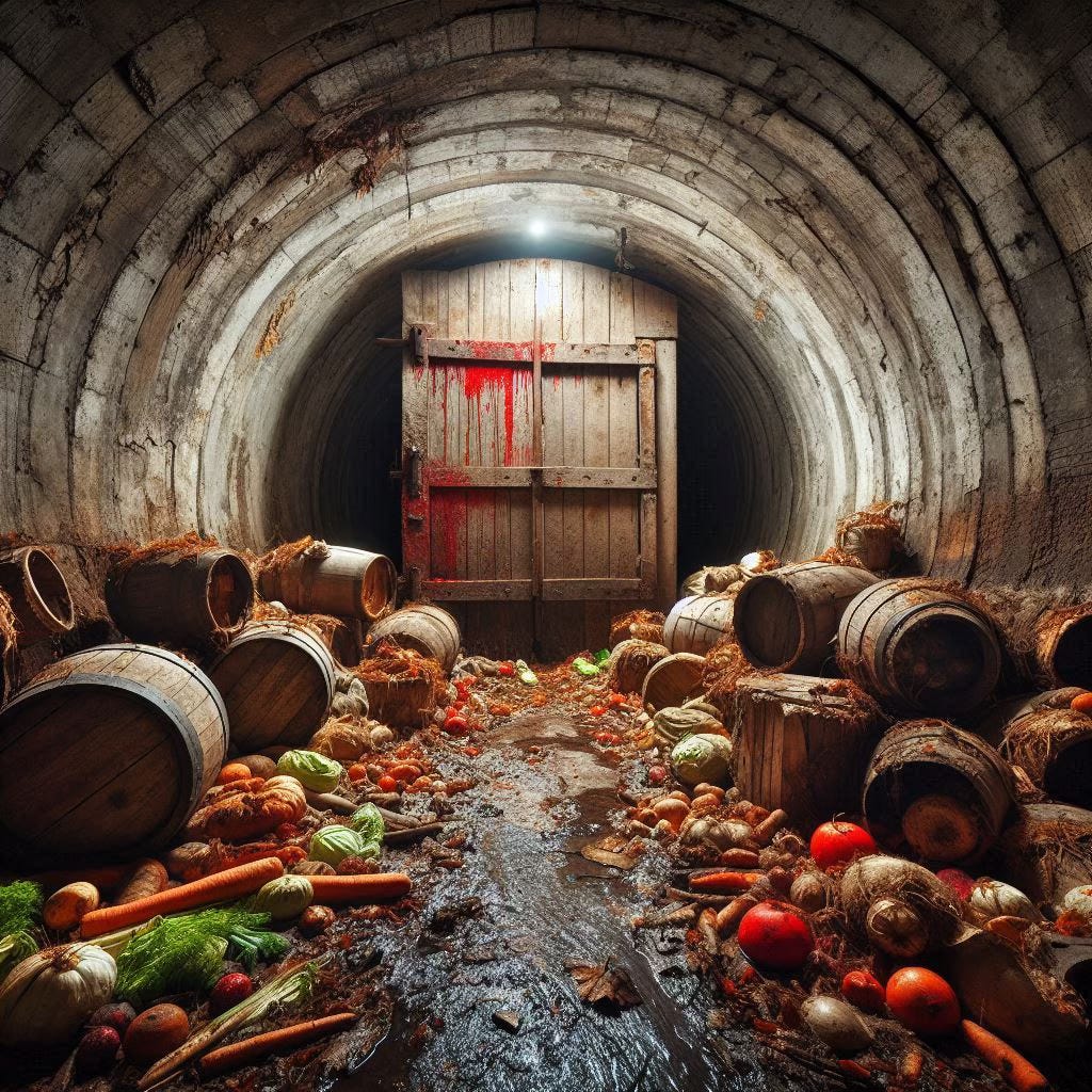 I further explored the tunnels until I finally came to a room. Deep underground and easily a half an hour had passed. The room and tunnel was littered with broken barrels of fresh and rotten food. At the far end of the room was a single wooden door with… blood.